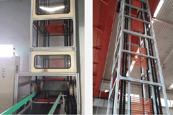 提升機(jī)是通過垂直方向的上、下通道完成對(duì)物品高度方向的升、降輸送,設(shè)備由物品提升的托板(或鏈板)、軌道、提升機(jī)構(gòu)和其它輔助設(shè)備構(gòu)成。通常提升機(jī)分為往復(fù)式提升機(jī)、連續(xù)式提升機(jī)、螺旋式提升機(jī)等。