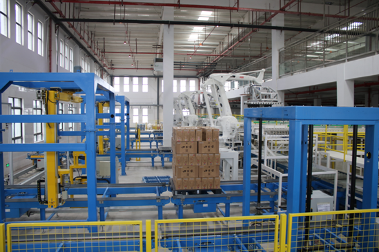 2. Project introduction: The System is divided into several sub-systems, respectively for finished product transportation, stacking, storage, and stock removal. In specific, it consists of more than 50,000 elevated storage positions, 17 double-deep stackers, 4 single-deep stackers, 10 sets of robotic stacking systems, a pallet conveying system, an electrical control system, a loop transportation system and a warehouse management system.