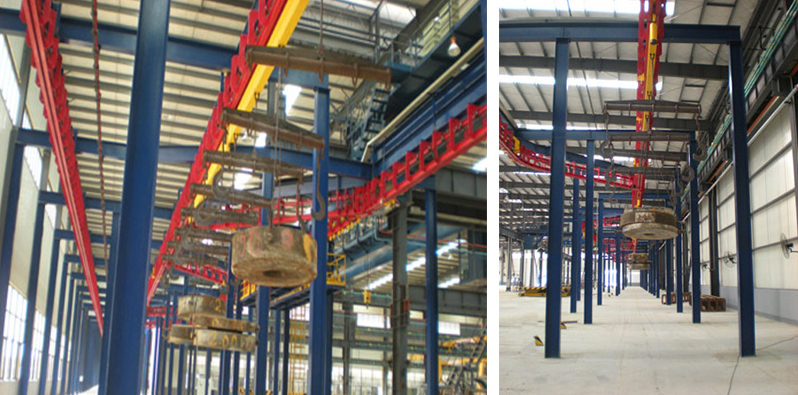 該輸送系統(tǒng)用于塔機結(jié)構(gòu)件的涂裝生產(chǎn)線,承擔涂裝工件的輸送,是全天候作業(yè)的工作場所。輸送的主要構(gòu)件有:塔身、塔頂、標準節(jié)、平衡臂、起重臂。工件外形尺寸:結(jié)構(gòu)件12000×2800×2800mm;重量:單掛6000kg、雙掛12000kg;生產(chǎn)綱領(lǐng):兩班制,年產(chǎn)3000臺套。系統(tǒng)采用公司新開發(fā)的重型積放式懸掛輸送機,該機具有載重量大,工作效率高等特點。