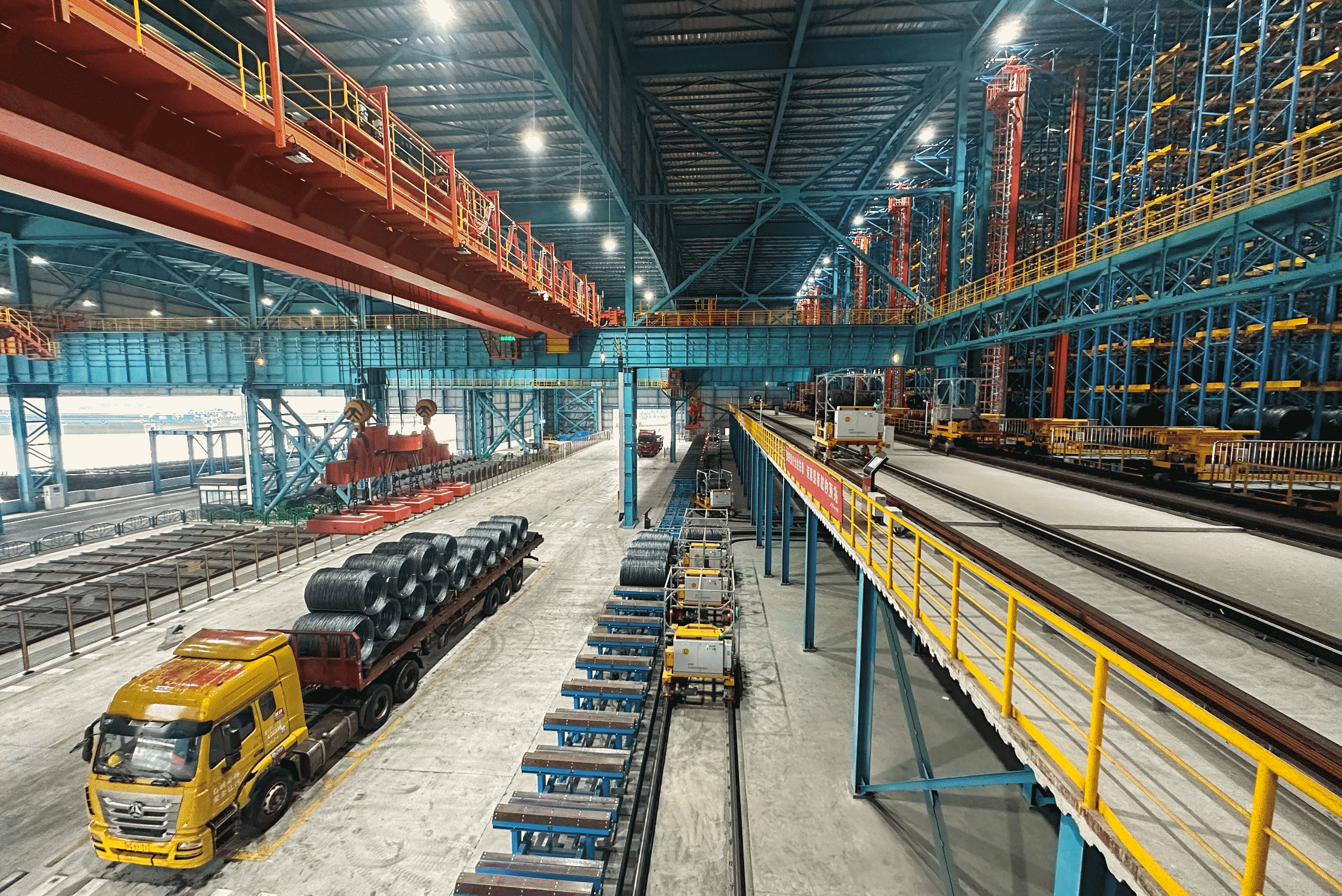 江蘇永鋼精品線材智能服務(wù)平臺(tái)項(xiàng)目的立體庫具備卓越的自動(dòng)化和智能化能力。它能同時(shí)全自動(dòng)對(duì)接2條盤條生產(chǎn)線,并通過車運(yùn)方式靈活對(duì)接另外3條生產(chǎn)線。此外,該立體庫還配備了6個(gè)無人自動(dòng)裝車月臺(tái)和2個(gè)裝船碼頭,確保高效運(yùn)作。在作業(yè)效率方面,每小時(shí)的出入庫量高達(dá)510卷,且能實(shí)現(xiàn)24小時(shí)不間斷作業(yè)。在裝載能力上,單日裝車能力超過0.8萬噸,單日裝船能力超過0.3萬噸。